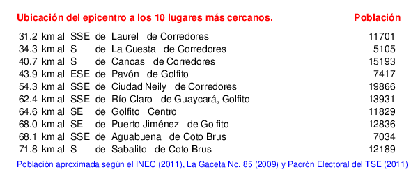 Mapa de la zona epicentral. Se muestran las poblaciones más cercanas al epicentro y fallas activas. Abajo están las distancias que hay del epicentro a cada uno de los diez sitios más cercanos y la cantidad de habitantes que poseen.