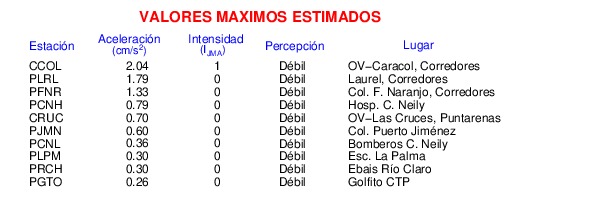 Intensidades en sitios de registro.Cada uno de los cuadrados en el mapa corresponde a la ubicación de un acelerógrafo al momento del sismo. Estos se muestran en distintos colores según la escala mostrada al pie de la figura.