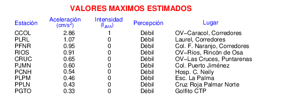 Intensidades en sitios de registro.Cada uno de los cuadrados en el mapa corresponde a la ubicación de un acelerógrafo al momento del sismo. Estos se muestran en distintos colores según la escala mostrada al pie de la figura.