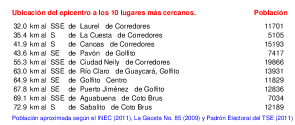 Mapa de la zona epicentral. Se muestran las poblaciones más cercanas al epicentro y fallas activas. Abajo están las distancias que hay del epicentro a cada uno de los diez sitios más cercanos y la cantidad de habitantes que poseen.