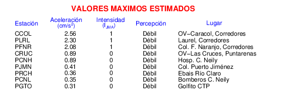 Intensidades en sitios de registro.Cada uno de los cuadrados en el mapa corresponde a la ubicación de un acelerógrafo al momento del sismo. Estos se muestran en distintos colores según la escala mostrada al pie de la figura.