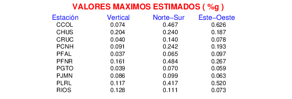 La siguiente tabla muestra los datos de aceleración máxima para cada componente en porcentaje de la aceleración de la gravedad (%g). Estos se obtienen dividiendo el valor del PGA registrado por 980 cm/s2 y multiplicándolo por 100.