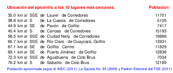 Mapa de la zona epicentral. Se muestran las poblaciones más cercanas al epicentro y fallas activas. Abajo están las distancias que hay del epicentro a cada uno de los diez sitios más cercanos y la cantidad de habitantes que poseen.