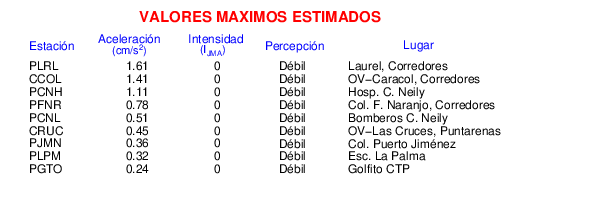 Intensidades en sitios de registro.Cada uno de los cuadrados en el mapa corresponde a la ubicación de un acelerógrafo al momento del sismo. Estos se muestran en distintos colores según la escala mostrada al pie de la figura.