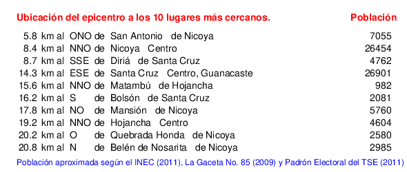 Mapa de la zona epicentral. Se muestran las poblaciones más cercanas al epicentro y fallas activas. Abajo están las distancias que hay del epicentro a cada uno de los diez sitios más cercanos y la cantidad de habitantes que poseen.