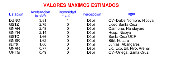 Intensidades en sitios de registro.Cada uno de los cuadrados en el mapa corresponde a la ubicación de un acelerógrafo al momento del sismo. Estos se muestran en distintos colores según la escala mostrada al pie de la figura.
