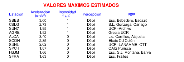 Intensidades en sitios de registro.Cada uno de los cuadrados en el mapa corresponde a la ubicación de un acelerógrafo al momento del sismo. Estos se muestran en distintos colores según la escala mostrada al pie de la figura.