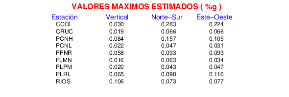 La siguiente tabla muestra los datos de aceleración máxima para cada componente en porcentaje de la aceleración de la gravedad (%g). Estos se obtienen dividiendo el valor del PGA registrado por 980 cm/s2 y multiplicándolo por 100.