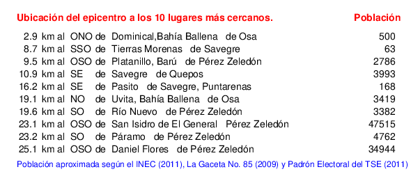 Mapa de la zona epicentral. Se muestran las poblaciones más cercanas al epicentro y fallas activas. Abajo están las distancias que hay del epicentro a cada uno de los diez sitios más cercanos y la cantidad de habitantes que poseen.