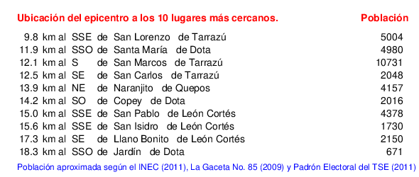 Mapa de la zona epicentral. Se muestran las poblaciones más cercanas al epicentro y fallas activas. Abajo están las distancias que hay del epicentro a cada uno de los diez sitios más cercanos y la cantidad de habitantes que poseen.