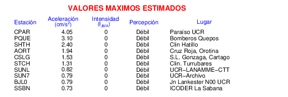 Intensidades en sitios de registro.Cada uno de los cuadrados en el mapa corresponde a la ubicación de un acelerógrafo al momento del sismo. Estos se muestran en distintos colores según la escala mostrada al pie de la figura.