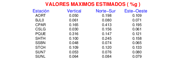 La siguiente tabla muestra los datos de aceleración máxima para cada componente en porcentaje de la aceleración de la gravedad (%g). Estos se obtienen dividiendo el valor del PGA registrado por 980 cm/s2 y multiplicándolo por 100.