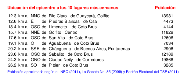 Mapa de la zona epicentral. Se muestran las poblaciones más cercanas al epicentro y fallas activas. Abajo están las distancias que hay del epicentro a cada uno de los diez sitios más cercanos y la cantidad de habitantes que poseen.
