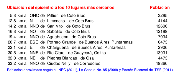 Mapa de la zona epicentral. Se muestran las poblaciones más cercanas al epicentro y fallas activas. Abajo están las distancias que hay del epicentro a cada uno de los diez sitios más cercanos y la cantidad de habitantes que poseen.