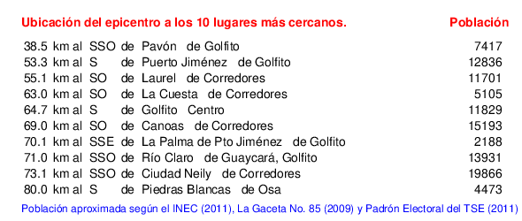 Mapa de la zona epicentral. Se muestran las poblaciones más cercanas al epicentro y fallas activas. Abajo están las distancias que hay del epicentro a cada uno de los diez sitios más cercanos y la cantidad de habitantes que poseen.