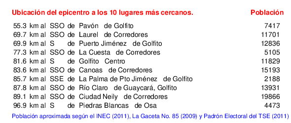 Mapa de la zona epicentral. Se muestran las poblaciones más cercanas al epicentro y fallas activas. Abajo están las distancias que hay del epicentro a cada uno de los diez sitios más cercanos y la cantidad de habitantes que poseen.