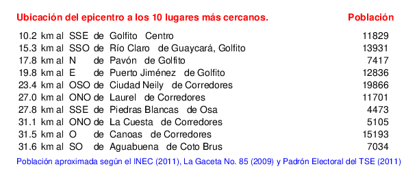 Mapa de la zona epicentral. Se muestran las poblaciones más cercanas al epicentro y fallas activas. Abajo están las distancias que hay del epicentro a cada uno de los diez sitios más cercanos y la cantidad de habitantes que poseen.