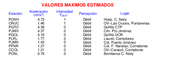 Intensidades en sitios de registro.Cada uno de los cuadrados en el mapa corresponde a la ubicación de un acelerógrafo al momento del sismo. Estos se muestran en distintos colores según la escala mostrada al pie de la figura.