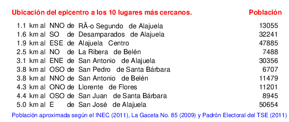 Mapa de la zona epicentral. Se muestran las poblaciones más cercanas al epicentro y fallas activas. Abajo están las distancias que hay del epicentro a cada uno de los diez sitios más cercanos y la cantidad de habitantes que poseen.