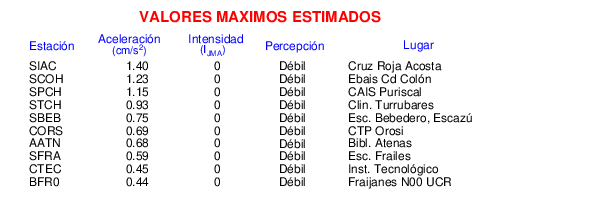 Intensidades en sitios de registro.Cada uno de los cuadrados en el mapa corresponde a la ubicación de un acelerógrafo al momento del sismo. Estos se muestran en distintos colores según la escala mostrada al pie de la figura.