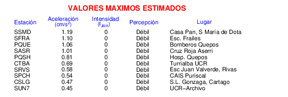 Intensidades en sitios de registro.Cada uno de los cuadrados en el mapa corresponde a la ubicación de un acelerógrafo al momento del sismo. Estos se muestran en distintos colores según la escala mostrada al pie de la figura.