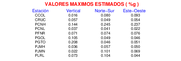 La siguiente tabla muestra los datos de aceleración máxima para cada componente en porcentaje de la aceleración de la gravedad (%g). Estos se obtienen dividiendo el valor del PGA registrado por 980 cm/s2 y multiplicándolo por 100.