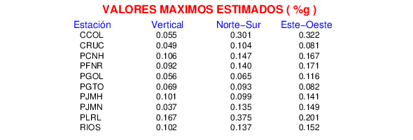 La siguiente tabla muestra los datos de aceleración máxima para cada componente en porcentaje de la aceleración de la gravedad (%g). Estos se obtienen dividiendo el valor del PGA registrado por 980 cm/s2 y multiplicándolo por 100.
