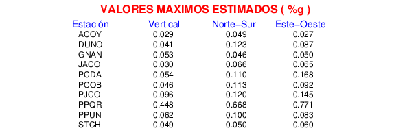 La siguiente tabla muestra los datos de aceleración máxima para cada componente en porcentaje de la aceleración de la gravedad (%g). Estos se obtienen dividiendo el valor del PGA registrado por 980 cm/s2 y multiplicándolo por 100.