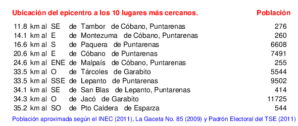 Mapa de la zona epicentral. Se muestran las poblaciones más cercanas al epicentro y fallas activas. Abajo están las distancias que hay del epicentro a cada uno de los diez sitios más cercanos y la cantidad de habitantes que poseen.