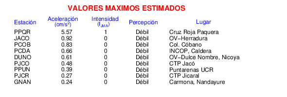 Intensidades en sitios de registro.Cada uno de los cuadrados en el mapa corresponde a la ubicación de un acelerógrafo al momento del sismo. Estos se muestran en distintos colores según la escala mostrada al pie de la figura.