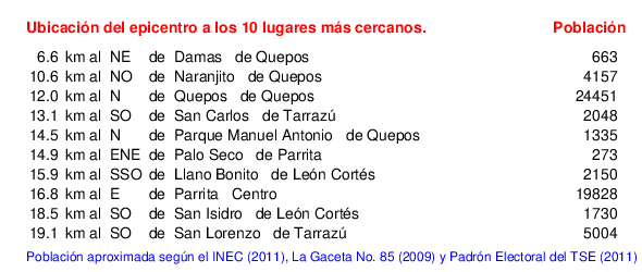 Mapa de la zona epicentral. Se muestran las poblaciones más cercanas al epicentro y fallas activas. Abajo están las distancias que hay del epicentro a cada uno de los diez sitios más cercanos y la cantidad de habitantes que poseen.
