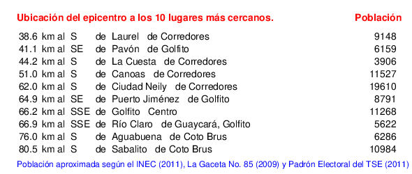 Mapa de la zona epicentral. Se muestran las poblaciones más cercanas al epicentro y fallas activas. Abajo están las distancias que hay del epicentro a cada uno de los diez sitios más cercanos y la cantidad de habitantes que poseen.