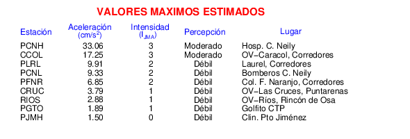 Intensidades en sitios de registro.Cada uno de los cuadrados en el mapa corresponde a la ubicación de un acelerógrafo al momento del sismo. Estos se muestran en distintos colores según la escala mostrada al pie de la figura.