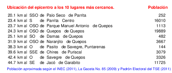 Mapa de la zona epicentral. Se muestran las poblaciones más cercanas al epicentro y fallas activas. Abajo están las distancias que hay del epicentro a cada uno de los diez sitios más cercanos y la cantidad de habitantes que poseen.