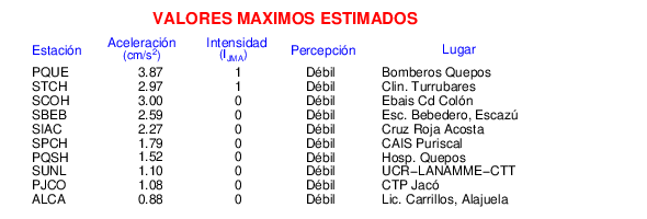 Intensidades en sitios de registro.Cada uno de los cuadrados en el mapa corresponde a la ubicación de un acelerógrafo al momento del sismo. Estos se muestran en distintos colores según la escala mostrada al pie de la figura.