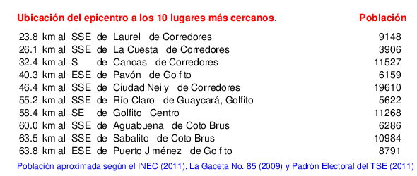 Mapa de la zona epicentral. Se muestran las poblaciones más cercanas al epicentro y fallas activas. Abajo están las distancias que hay del epicentro a cada uno de los diez sitios más cercanos y la cantidad de habitantes que poseen.