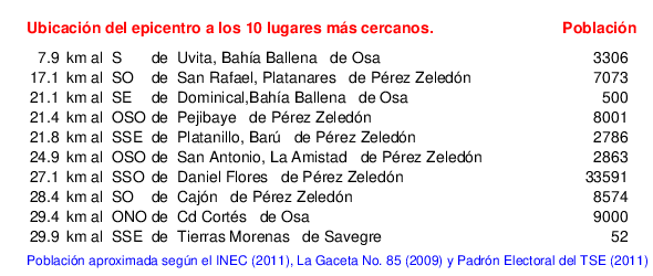 Mapa de la zona epicentral. Se muestran las poblaciones más cercanas al epicentro y fallas activas. Abajo están las distancias que hay del epicentro a cada uno de los diez sitios más cercanos y la cantidad de habitantes que poseen.