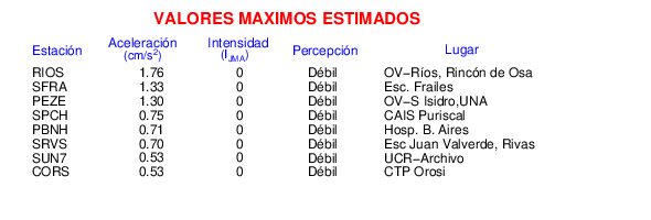 Intensidades en sitios de registro.Cada uno de los cuadrados en el mapa corresponde a la ubicación de un acelerógrafo al momento del sismo. Estos se muestran en distintos colores según la escala mostrada al pie de la figura.