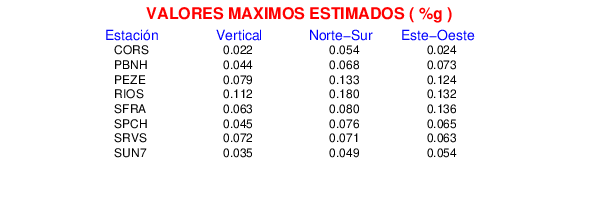 La siguiente tabla muestra los datos de aceleración máxima para cada componente en porcentaje de la aceleración de la gravedad (%g). Estos se obtienen dividiendo el valor del PGA registrado por 980 cm/s2 y multiplicándolo por 100.