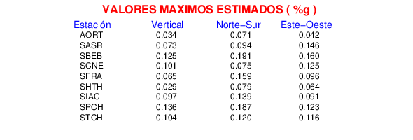 La siguiente tabla muestra los datos de aceleración máxima para cada componente en porcentaje de la aceleración de la gravedad (%g). Estos se obtienen dividiendo el valor del PGA registrado por 980 cm/s2 y multiplicándolo por 100.