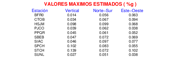 La siguiente tabla muestra los datos de aceleración máxima para cada componente en porcentaje de la aceleración de la gravedad (%g). Estos se obtienen dividiendo el valor del PGA registrado por 980 cm/s2 y multiplicándolo por 100.