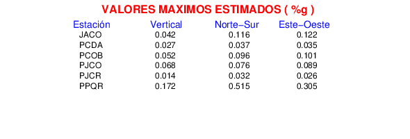 La siguiente tabla muestra los datos de aceleración máxima para cada componente en porcentaje de la aceleración de la gravedad (%g). Estos se obtienen dividiendo el valor del PGA registrado por 980 cm/s2 y multiplicándolo por 100.