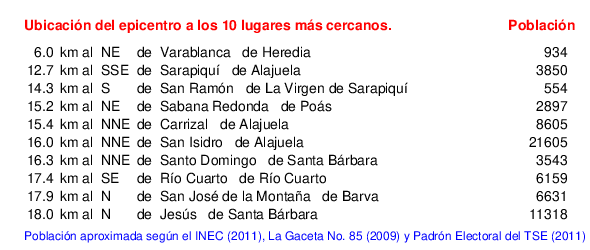 Mapa de la zona epicentral. Se muestran las poblaciones más cercanas al epicentro y fallas activas. Abajo están las distancias que hay del epicentro a cada uno de los diez sitios más cercanos y la cantidad de habitantes que poseen.