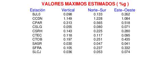 La siguiente tabla muestra los datos de aceleración máxima para cada componente en porcentaje de la aceleración de la gravedad (%g). Estos se obtienen dividiendo el valor del PGA registrado por 980 cm/s2 y multiplicándolo por 100.