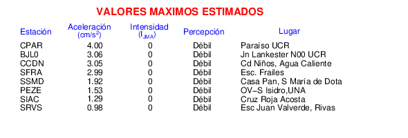 Intensidades en sitios de registro.Cada uno de los cuadrados en el mapa corresponde a la ubicación de un acelerógrafo al momento del sismo. Estos se muestran en distintos colores según la escala mostrada al pie de la figura.