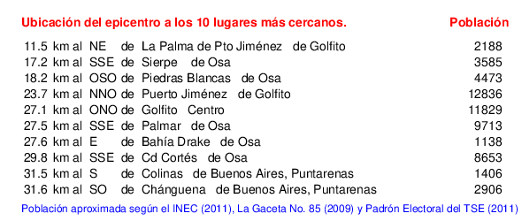Mapa de la zona epicentral. Se muestran las poblaciones más cercanas al epicentro y fallas activas. Abajo están las distancias que hay del epicentro a cada uno de los diez sitios más cercanos y la cantidad de habitantes que poseen.