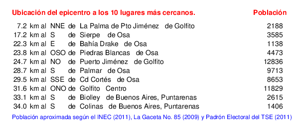 Mapa de la zona epicentral. Se muestran las poblaciones más cercanas al epicentro y fallas activas. Abajo están las distancias que hay del epicentro a cada uno de los diez sitios más cercanos y la cantidad de habitantes que poseen.
