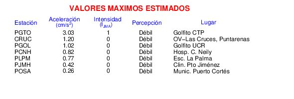 Intensidades en sitios de registro.Cada uno de los cuadrados en el mapa corresponde a la ubicación de un acelerógrafo al momento del sismo. Estos se muestran en distintos colores según la escala mostrada al pie de la figura.