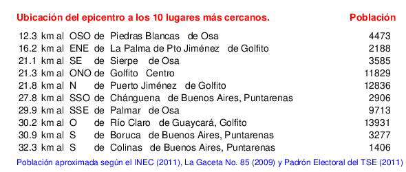 Mapa de la zona epicentral. Se muestran las poblaciones más cercanas al epicentro y fallas activas. Abajo están las distancias que hay del epicentro a cada uno de los diez sitios más cercanos y la cantidad de habitantes que poseen.