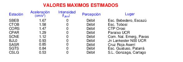 Intensidades en sitios de registro.Cada uno de los cuadrados en el mapa corresponde a la ubicación de un acelerógrafo al momento del sismo. Estos se muestran en distintos colores según la escala mostrada al pie de la figura.